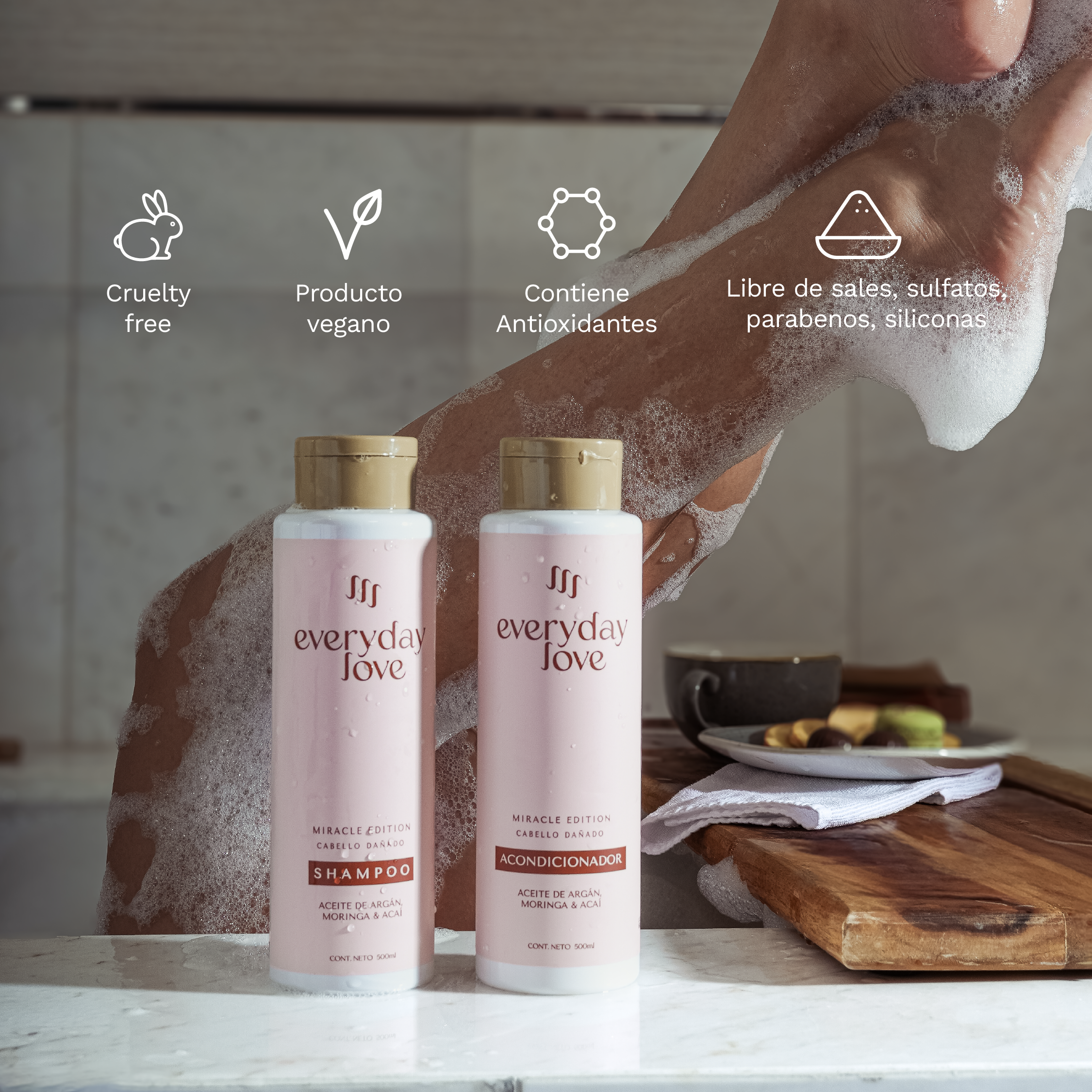 Kit completo para una rutina de cuidado capilar: Shampoo, Acondicionador, Termoprotector y Óleo Capilar Miracle Edition. Hidrata, protege y aporta un brillo radiante.
