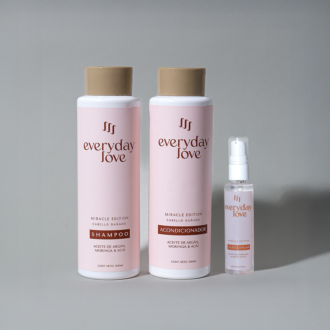 Recovery Kit de Everyday Love: Shampoo y Acondicionador Miracle Edition (500 ml) + Óleo Capilar (60 ml). Limpia, hidrata y nutre profundamente para un cabello fuerte y saludable.