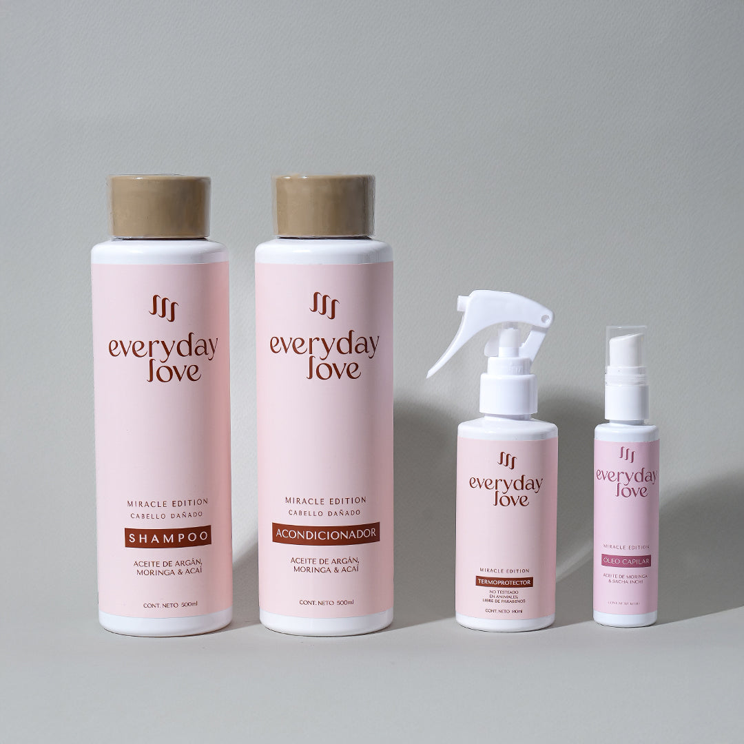 Kit completo para una rutina de cuidado capilar: Shampoo, Acondicionador, Termoprotector y Óleo Capilar Miracle Edition. Hidrata, protege y aporta un brillo radiante.